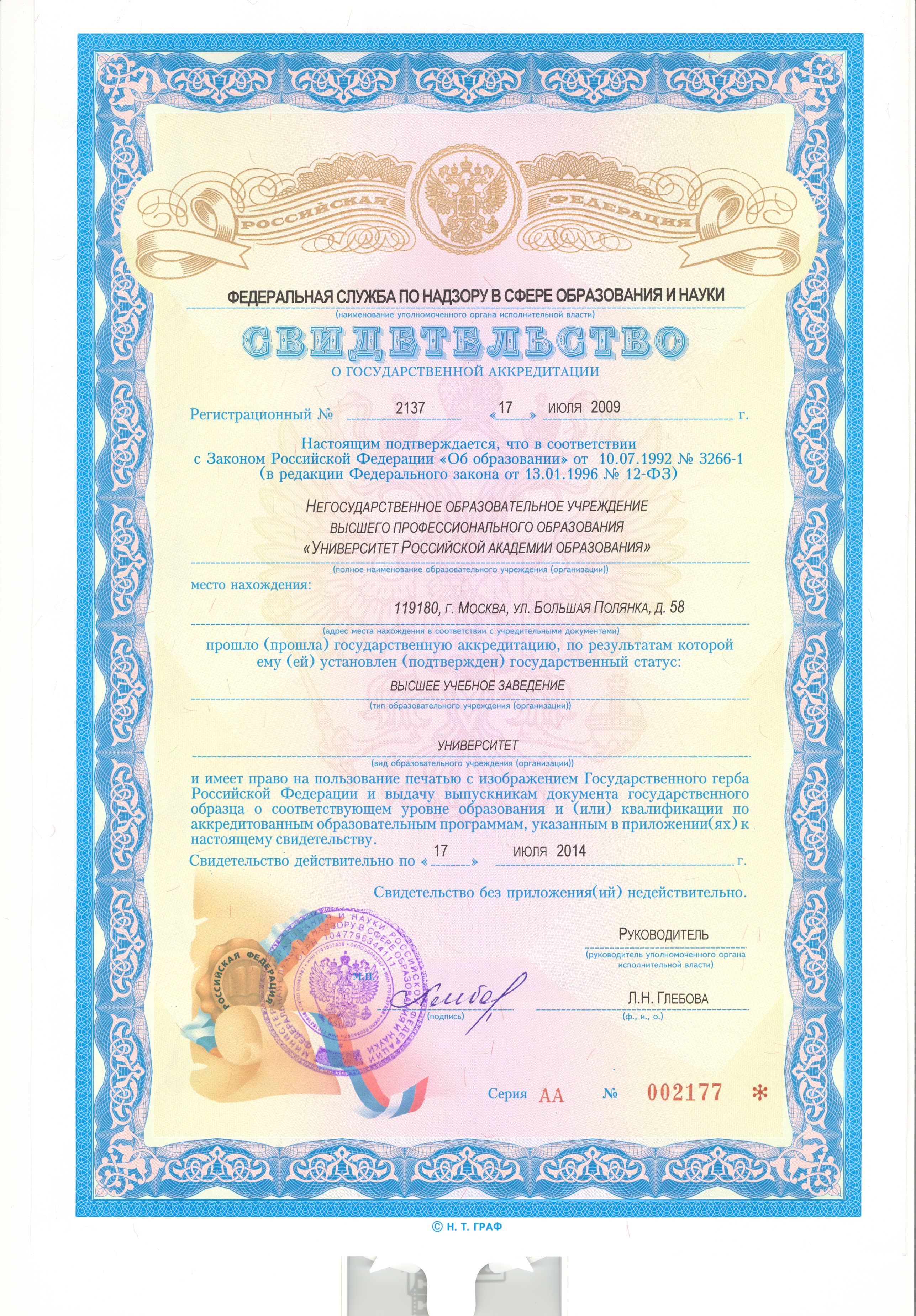 • Свидетельство о государственной аккредитации Серия АА №002177, регистрационный № 2137 от 17 июля 2009 г., действительно по 17 июля 2014 г.